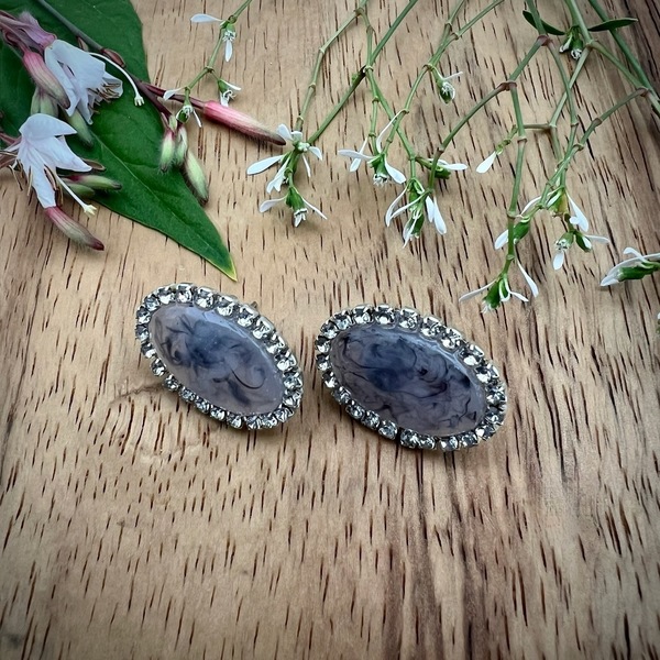 Elegant oval statement earrings featuring a marbled lavender-grey centre,framed with sparkling rhinestones